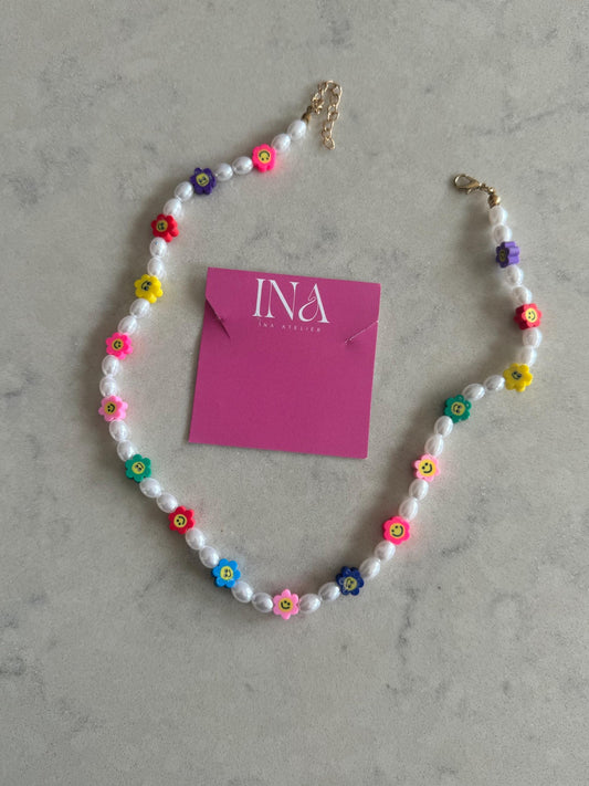 Multicoloured Smiley Flower Face and White Pearl Bead Necklace Choker